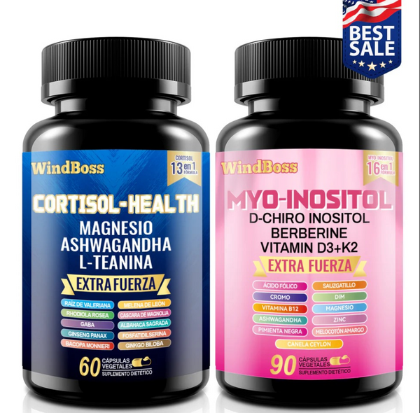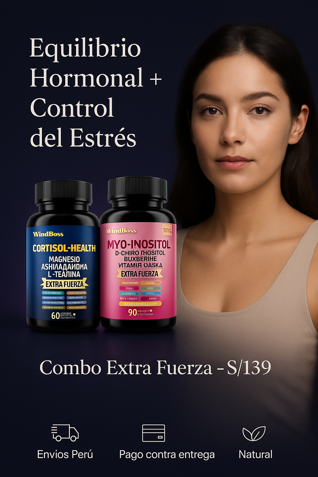 El combo trae 2 frascos: uno de Cortisol-Health y otro de Myo-Inositol Extra Fuerza, que trabajan juntos para apoyar tu equilibrio hormonal, energía y bienestar diario.